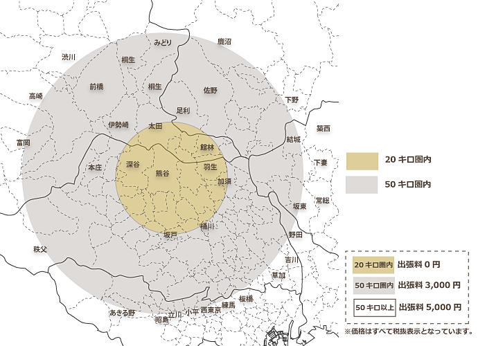 対応エリア(熊谷市、深谷市、太田市、大泉町、千代田町、行田市、鴻巣市、吉見町、東松山市、滑川町、嵐山町、小川町、寄居町、美里町、本庄市、伊勢崎市、足利市、邑楽町、館林市、板倉町、明和町、羽生市、加須市、騎西町、菖蒲町、北本市、桶川市、川島町、坂戸市、鳩山町、ときがわ町、秩父市、東秩父村、渋川市、高崎市、藤岡市、前橋市、桐生市、みどり市、佐野市、鹿沼市、栃木市、小山市、下野市、小山市、結城市、築西市、下妻市、古河市、坂東市、常総市、野田市、吉川市、草加市、久喜市、春日部市、蓮田市、上尾市、川越市、鶴ヶ島市、日高市、飯能市、狭山市、ふじみ野市、富士見市、入間市、所沢市、志木市、青梅市、羽村市、福生市、武蔵村山市、立川市、小平市、東久留米市、西東京市、練馬区、板橋区、清瀬市、新座市、朝霞市、和光市、戸田市、蕨市、鳩ケ谷市、川口市、越谷市、北区、西区、大宮区、中央区、見沼区、緑区、浦和区、南区、桜区、岩城区など)[一部抜粋、順序不同]